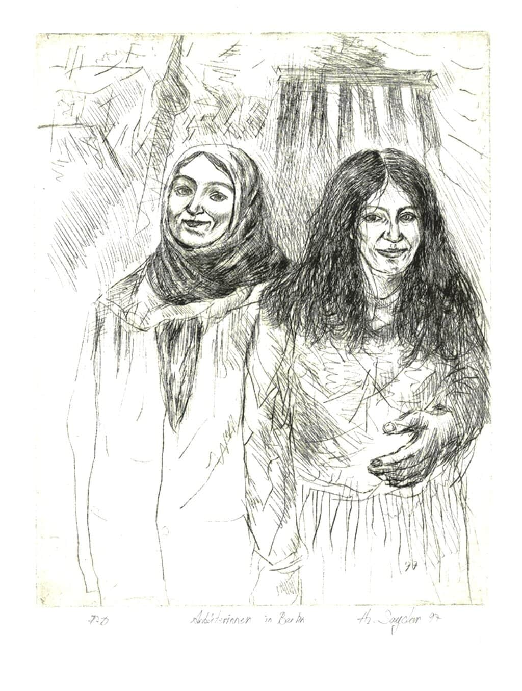 „Stadtbild“ zwei Arbeiterinnen in Berlin, Radierung 1997